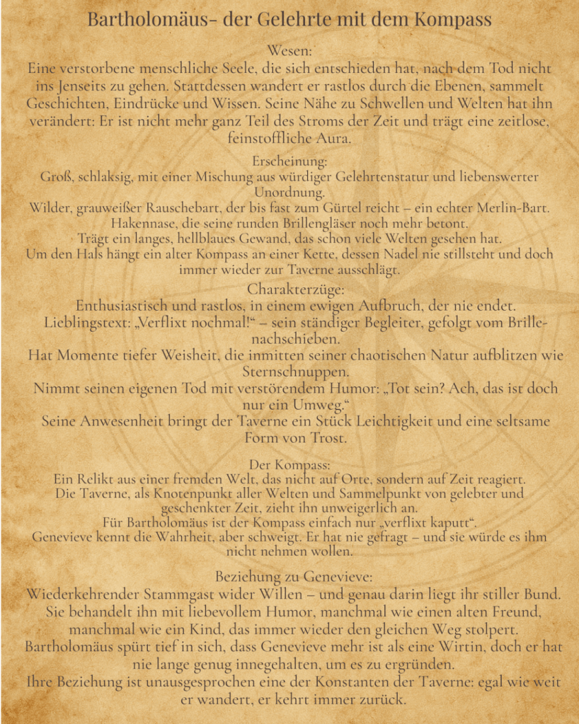 Bartholomäus bringt Leichtigkeit und Trost in die Taverne, auch wenn er selbst nie zur Ruhe kommt. Sein Lieblingsausruf „Verflixt nochmal!“ ist vielen Gästen vertraut, ebenso wie seine endlosen Anekdoten, die zwischen tiefer Weisheit und liebenswerter Unordnung pendeln.